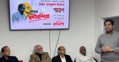 লন্ডন, ২০ অক্টোবর। কথাশিল্পী সৈয়দ মনজুরুল ইসলাম স্মরণসভায় বক্তারা বলেন, তিনি শিক্ষক হিসাবে বেঁচে থাকতে চেয়েছেন আজীবন। তাকে এক সময় ঢাকা বিশ্ববিদ্যালয়ের উপাচার্যর দায়িত্ব নিতে অনুরোধ করা হলেও তিনি তা গ্রহণ করেননি। তিনি বলেন ‘আমি শিক্ষক হিসেবে বেঁচে থাকতে চাই।’
