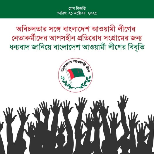 সমগ্র দেশবাসী প্রত্যক্ষ করছে যে, বাংলাদেশ আওয়ামী লীগের নেতাকর্মীরা জনগণের অধিকার প্রতিষ্ঠার জন্য লড়ছে, দেশ রক্ষার সংগ্রামে লিপ্ত। এ লড়াই ন্যায় প্রতিষ্ঠার লড়াই। অবৈধ দখলদার খুনি-ফ্যাসিস্ট ইউনূস গং অসাংবিধানিকভাবে রাষ্ট্রক্ষমতা দখল করে জনগণের অধিকার হরণ করেছে, দেশ ধ্বংসের পাঁয়তারা করছে। অন্যদিকে বঙ্গবন্ধু কন্যা জননেত্রী শেখ হাসিনার নির্দেশে বাংলাদেশ আওয়ামী লীগের নেতাকর্মীরা হিমালয়সম মনোবল নিয়ে এই অনিয়ম, অন্যায়, অবিচার, নিষ্ঠুর দুঃশাসন সর্বোপরি দেশ বিক্রির পাঁয়তারা রুখে দিতে জীবন বাজি রেখে আপসহীন প্রতিরোধ সংগ্রাম গড়ে তুলেছে। দেশ ও জনগণের পক্ষে কণ্ঠস্বর যত জোরালো হচ্ছে জুলুমবাজ ইউনূসের দমন-পীড়ন অত্যাচার-নির্যাতন তত মাত্রা ছাড়িয়ে যাচ্ছে। তবে এই নির্মম অত্যাচার-নির্যাতনের পরেও খুনি-ফ্যাসিস্ট ইউনূসের দানবীয় শাসনের বিরুদ্ধে আওয়ামী লীগের নেতাকর্মীরা অপ্রতিরোধ্য। আওয়ামী লীগের তৃণমূলের নেতাকর্মীদের এই আত্মত্যাগ বৃথা যাবে না। বাধার বিন্ধ্যাচল ডিঙিয়ে তিমিরবিদারী অরুণের উদয় হবেই। বাংলাদেশ আওয়ামী লীগের আহ্বানে যে সকল নেতাকর্মীরা রক্তখেকো ইউনূসের রক্তচক্ষুকে উপেক্ষা করে জীবন বাজি রেখে এই প্রতিরোধ সংগ্রামে অবতীর্ণ হয়েছে দলের পক্ষ থেকে তাদেরকে আন্তরিক ধন্যবাদ জানাচ্ছি। বিজয় আমাদের হবেই, ইনশাল্লাহ। জয় বাংলা জয় বঙ্গবন্ধু বাংলাদেশ চিরজীবী হোক।