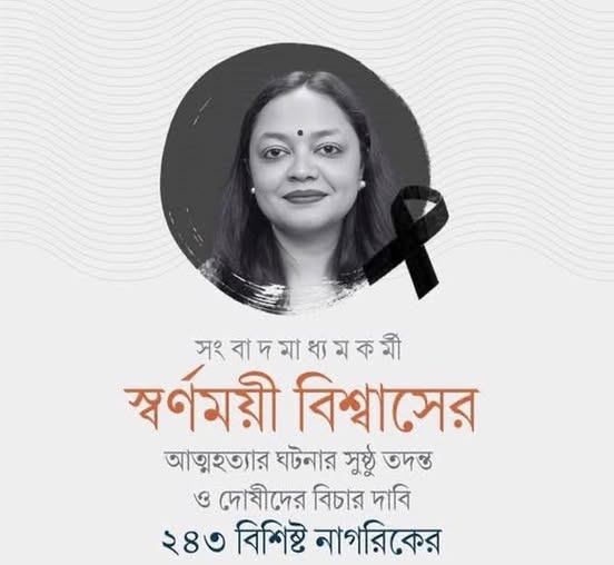 আমরা মনে করি, স্বর্ণময়ী বিশ্বাসের মৃত্যু দেশের সাংবাদিক সমাজ, সৃজনশীল মানুষ ও নাগরিক বিবেকের জন্য এক কঠিন প্রশ্ন রেখে গেছেন। এ ঘটনায় আমরা গভীর উদ্বেগ ও ক্ষোভ প্রকাশ করছি। স্বর্ণময়ী বিশ্বাসের মৃত্যু যেন আরেকটি ‘সংবাদ’ হয়ে হারিয়ে না যায়। আমরা চাই, তার মৃত্যু হোক পরিবর্তনের সূচনা, ন্যায়বিচারের জাগরণ।
