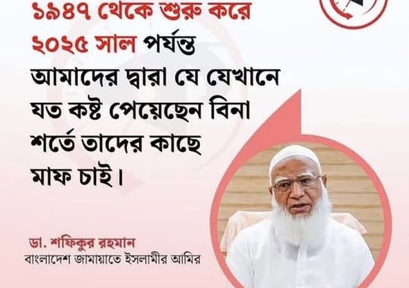 তিনি বলেন, ‘আজকে আবার প্রকাশ্যে বলে গেলাম, সাতচিল্লশ থেকে শুরু করে ২০২৫ সালের ২২ অক্টোবর পর্যন্ত আমাদের দ্বারা যে যেখানে কষ্ট পেয়েছেন, আমরা বিনা শর্তে যারা কষ্ট পেয়েছেন, তাদের কাছে মাফ চাই। এটা গোটা জাতি হলেও চাই, ব্যক্তি হলেও চাই। কোনো অসুবিধা নাই। আমি এ কথা জীবনে বলি নাই, আমার কোনো সহকর্মী বলেন নাই, আমার সিনিয়র যারা ছিলেন, তারা বলেন নাই যে—আমরা সকল ভুলের ঊর্ধ্বে। কোনো দল যদি দাবি করে যে তারা সকল ভুলের ঊর্ধ্বে—অবশ্যই জাতি এটা মানবে না।’