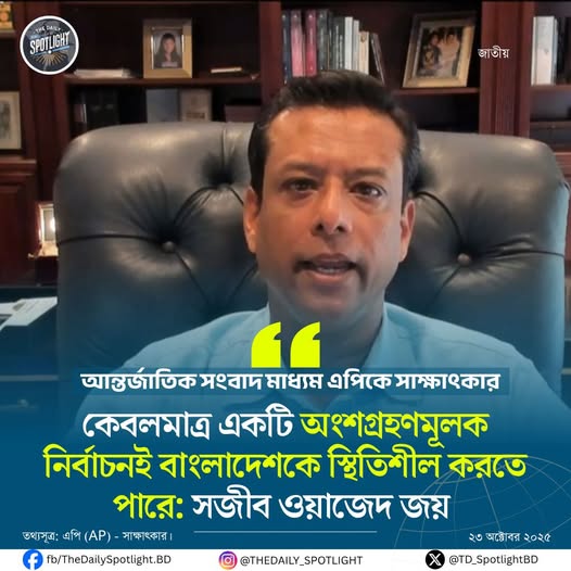 জননেত্রী শেখ হাসিনার পুত্র ও ডিজিটাল বাংলাদেশের স্থপতি সজীব ওয়াজেদ জয় বলেছেন, কেবলমাত্র একটি সর্বসমন্বিত ও অংশগ্রহণমূলক নির্বাচনই দেশকে রাজনৈতিক স্থিতিশীলতার পথে ফিরিয়ে আনতে পারে।