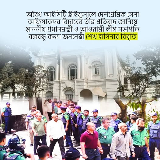 আওয়ামী লীগ সভাপতি বঙ্গবন্ধু কন্যা জননেত্রী দেশরত্ন শেখ হাসিনা আজ এক বিবৃতিতে বলেন, বাংলাদেশ এক অদ্ভুত ও অকল্পনীয় ঘটনার সাক্ষী হলো। যে আইসিটি ট্রাইব্যুনালে মহান মুক্তিযুদ্ধে মানবতাবিরোধী অপরাধ সংঘটনকারী যুদ্ধাপরাধীদের বিচার হয়েছে সেখানে দেশের স্বাধীনতা ও সার্বভৌমত্ব রক্ষার অতন্দ্র প্রহরী দেশপ্রেমিক সেনাবাহিনীর সদস্যদের বিচার করা অত্যন্ত গর্হিত কাজ। আমি এর তীব্র নিন্দা ও প্রতিবাদ জানাই। একইসাথে বলছি, অবৈধ আইসিটি ট্রাইব্যুনাল সহ প্রহসনমূলক বিচার বন্ধ করতে হবে। সকল রাজনৈতিক বন্দিদের নিঃশর্ত মুক্তি দিতে হবে।