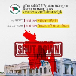 সর্বকালের সর্বশ্রেষ্ঠ বাঙালি জাতির পিতা বঙ্গবন্ধু শেখ মুজিবুর রহমানের কন্যা, গণপ্রজাতন্ত্রী বাংলাদেশ সরকারের মাননীয় প্রধানমন্ত্রী, বাংলাদেশ আওয়ামী লীগ সভাপতি, গণতন্ত্রের মানসকন্যা জননেত্রী দেশরত্ন শেখ হাসিনার বিরুদ্ধে তথাকথিত বেআইনি আন্তর্জাতিক অপরাধ ট্রাইব্যুনালের (আইসিটি) রায় দেশবাসীর সঙ্গে বাংলাদেশ আওয়ামী লীগ ঘৃণাভরে প্রত্যাখান করে এক বিবৃতি প্রদান ও অবৈধ সরকারে পদত্যাগের দাবীতে কর্ম সূচী দিয়েছে। কর্মসূচিতে রয়েছে ১৮ নভেম্বর : সারা দেশে সর্বাত্মক শাটডাউন,১৯-২১ নভেম্বর : সারা দেশে বিক্ষোভ, প্রতিবাদ এবং প্রতিরোধ।