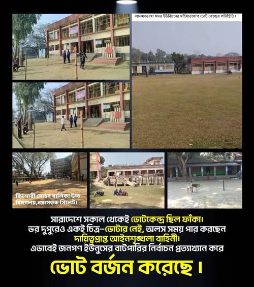ভোটের দিনের হাতশাজনক এই চিত্র দেখে অনেকেই হতবাক। প্রকৃত প্রস্তাবে জনগন ভোট বর্জন করেছে এমনটাই মূল খবর। পাতানো কোনো নির্বাচনই জনগণকে যে জাগাতে পারে না, এবারের নির্বাচন তারই প্রমান।