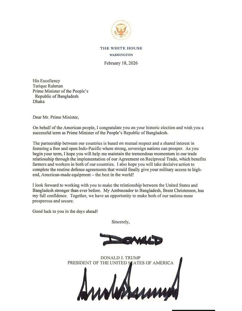 গত ১৮ই ফেব্রুয়ারি হোয়াইট হাউজ থেকে পাঠানো চিঠিতে ট্রাম্প বাংলাদেশের প্রধানমন্ত্রী তারেক রহমানকে তার “ঐতিহাসিক নির্বাচনী বিজয়”-এর জন্য অভিনন্দন জানান এবং সাফল্য কামনা করেন।